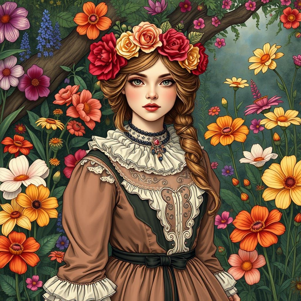 This image shows a young woman in a whimsical garden, surrounded by vibrant flowers, with intricate details and delicate lines, reminiscent of classic art nouveau and watercolor illustrations.