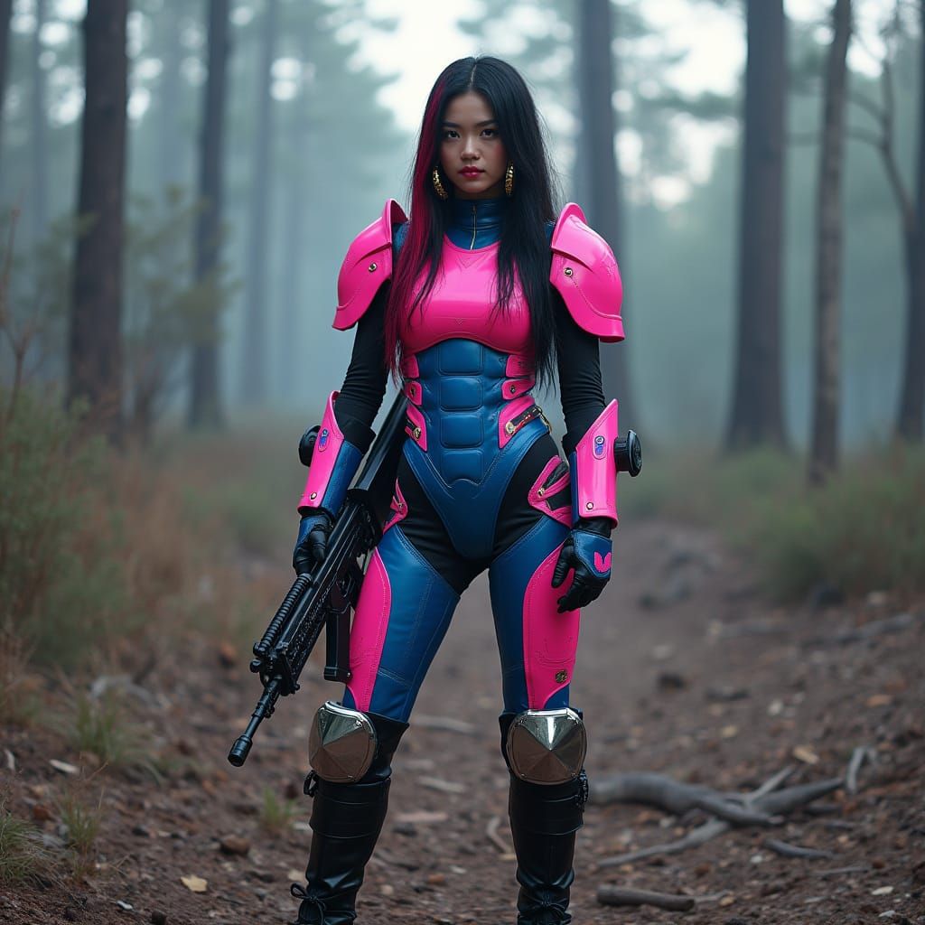 This synthwave image shows a confident Korean author with vibrant hair, wearing pink and blue battle armor and holding an M16 in a desolate forest.