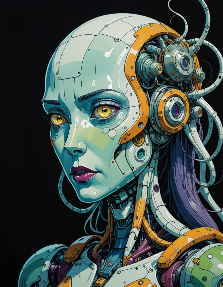 This image features a beautiful female robot face with a unique blend of gouache and watercolor, presented in a retro comic book aesthetic with soft pastel colors and dramatic lighting.
