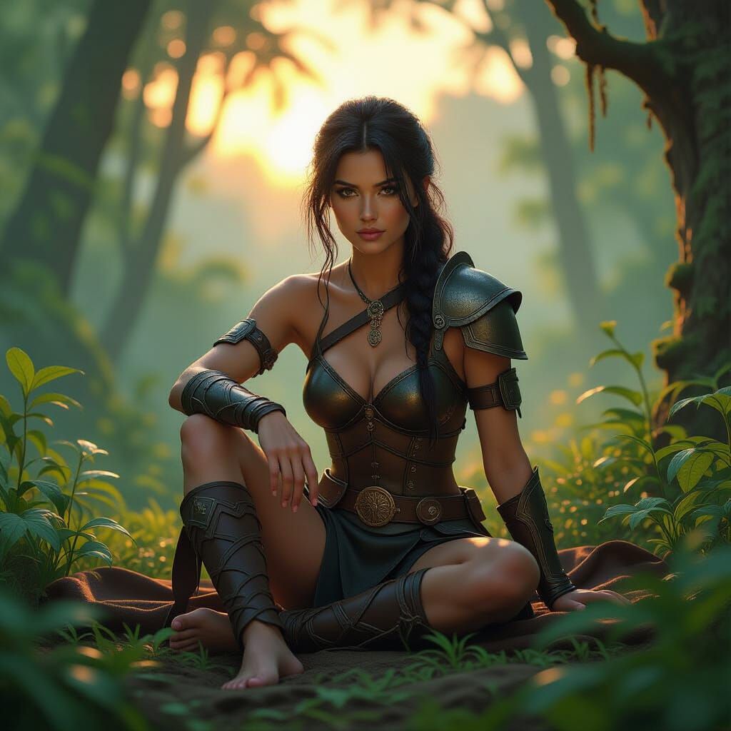 This image shows a slender woman warrior with black hair resting in a vibrant forest. The artwork has a matte-painted style with rich colors, intricate details and a dreamlike quality.