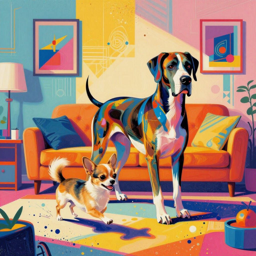 This vibrant screen print style image depicts a tiny chihuahua playfully pursuing a Great Dane within a cozy sitting room, featuring bold colors and Bauhaus-inspired geometric patterns.