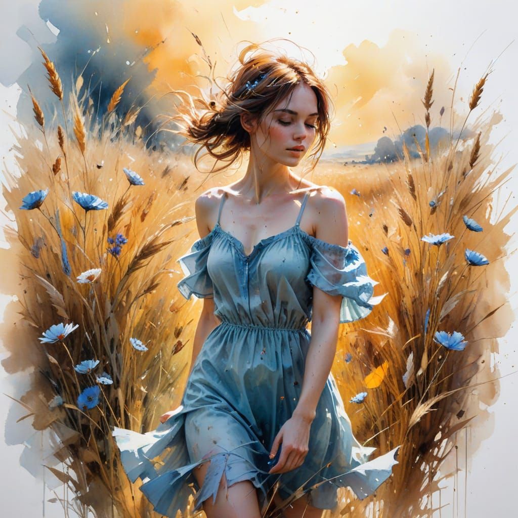 This enchanting watercolour painting captures a sun-kissed meadow in full bloom, with golden light dancing across rippling grasses and vibrant wildflowers. A serene atmosphere prevails, with subtle echoes of nature's sounds and soft, dreamy shadows.