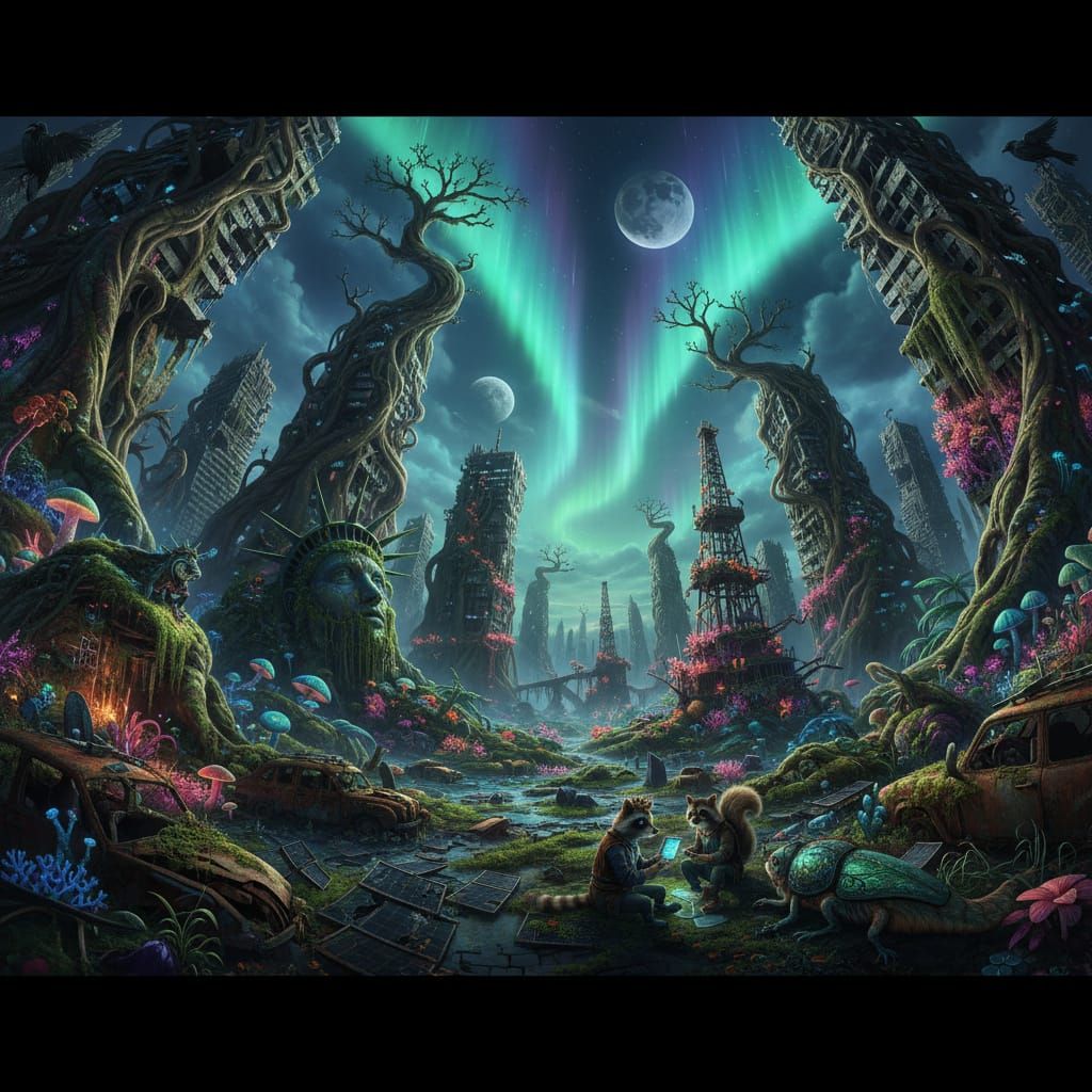 This image depicts a surreal, cinematic vision of Earth millions of years post-humanity. Nature reclaims vast city ruins with colossal flora and mutated wildlife under twin moons and auroras.