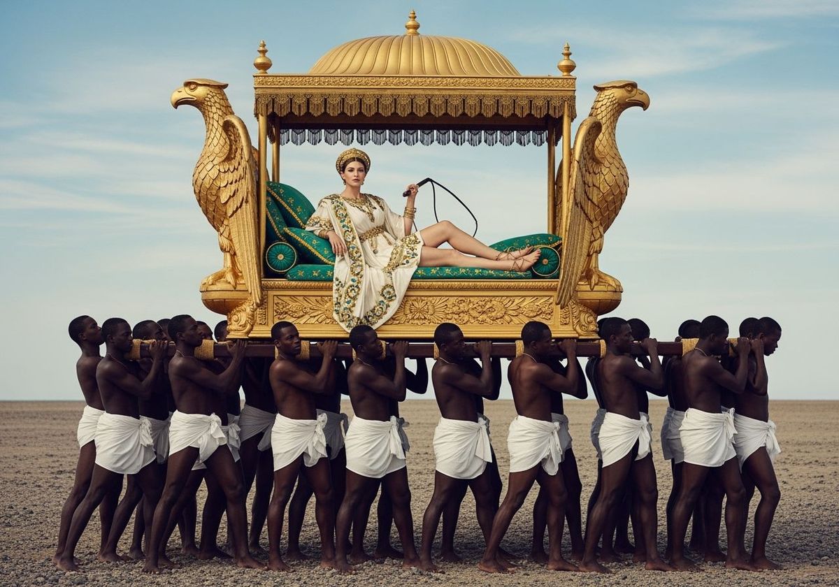 This image shows a Roman Empress in a gold toga, barefoot and lounging on a gold chaise lounge. Twenty servants carry the throne. The scene is captured with natural lighting and sharp focus, in a hyperrealistic style.