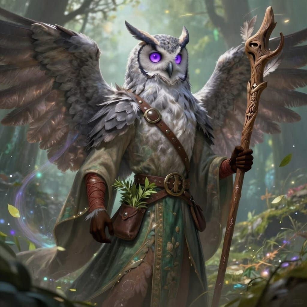 Craft unique Owlin Druid characters in high-fantasy style. Unleash your creativity with our free AI image generator today!