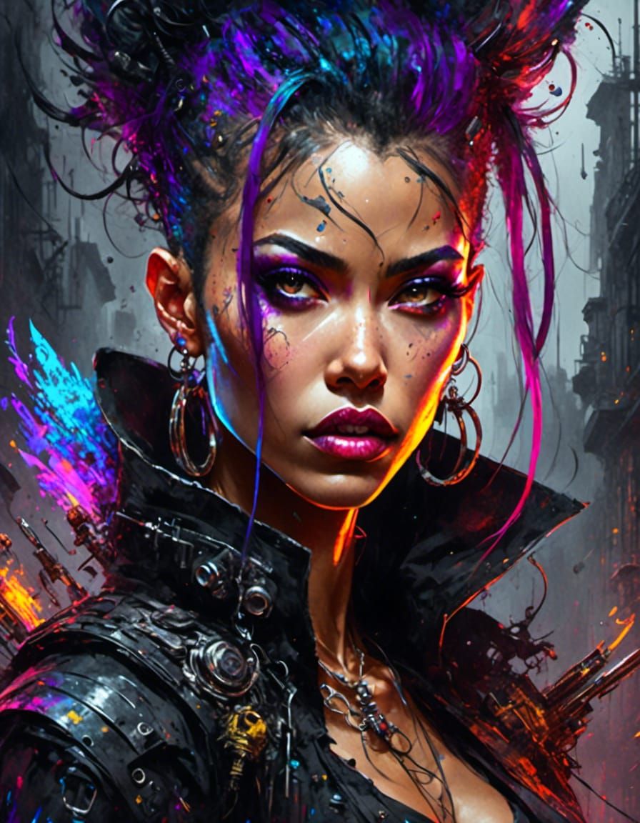 A vivid portrait of a snarling, angry cyberpunk cyborg punk with long fangs. The image showcases tetradic colors and a vibrant, heavily modified aesthetic.