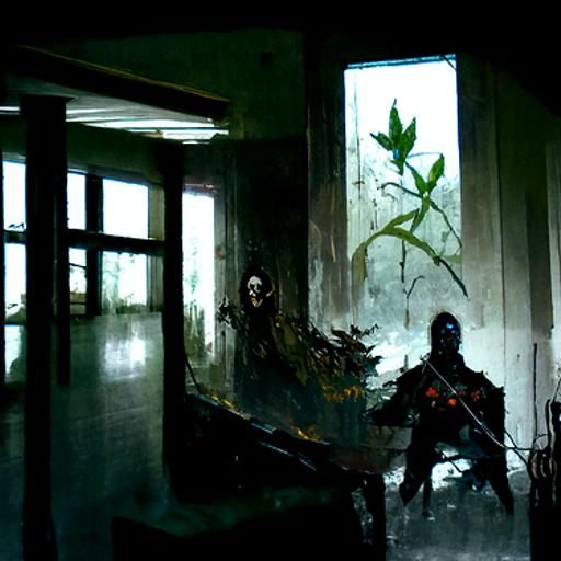 This image shows a derelict hospital hallway overtaken by nature. Foliage sprouts from window openings, contrasting with a dark, ominous silhouette lurking in the corner in a sinister style.