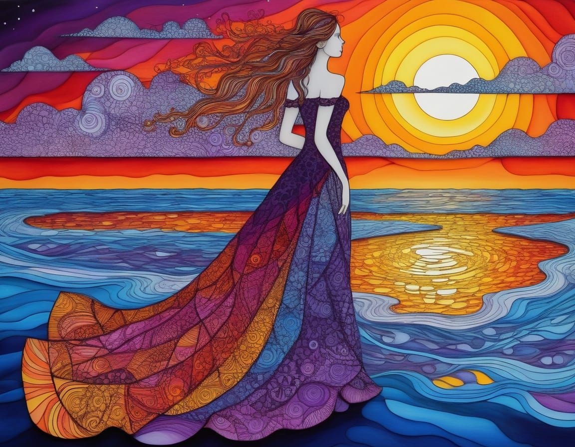 This image shows a woman in a flowing dress by a river, with a giant setting sun in the background. The art style features fractal clouds and geometric shapes in vibrant colors.
