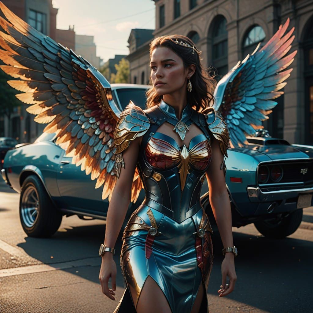 This image showcases a stunning female angel in a dramatic pose with a brightly colored muscle car. The intricate details and complementary colors create a breathtaking scene, with iridescent wings and sparkling jewelry reflecting the golden hour glow.