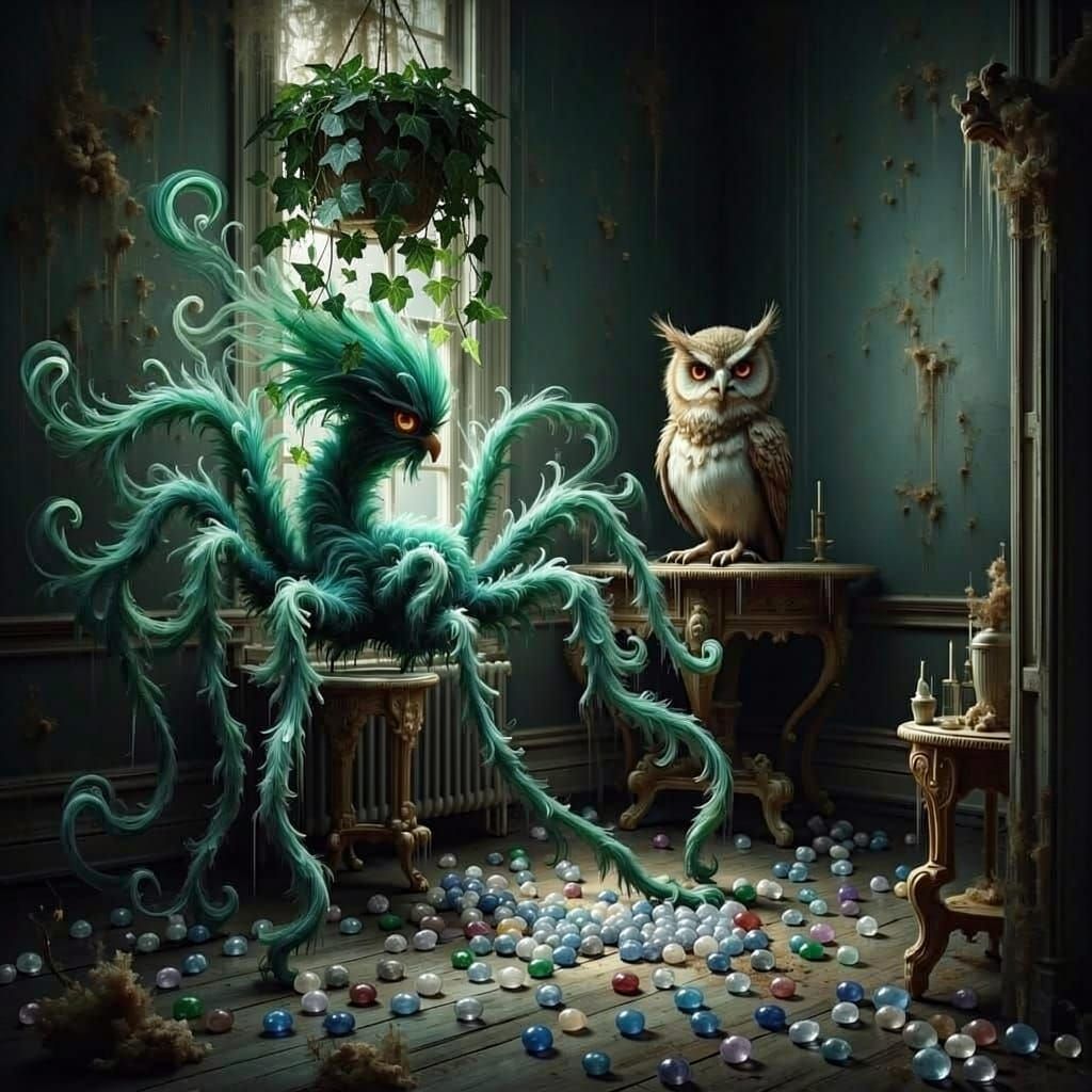 This haunting image depicts a tarantula and owl inhabiting a rundown apartment. Rendered in a dark, illustrative style reminiscent of Gustave Doré, the scene evokes a sense of unease.