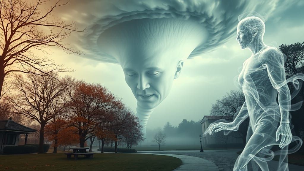 This haunting image captures a serene park frozen in time, juxtaposed with a swirling tornado and a ghostly figure, evoking a sense of unsettling mystery and cinematic storytelling.