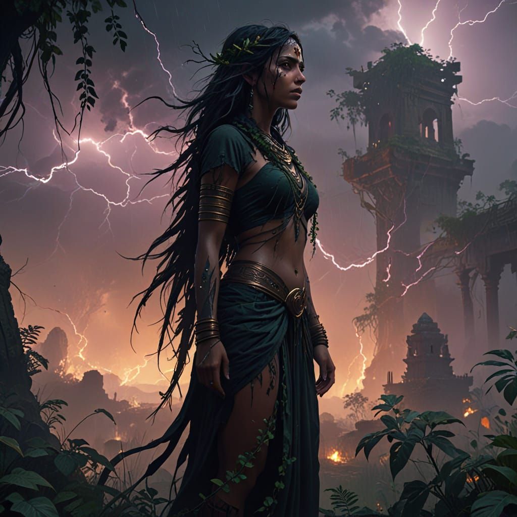 A double exposure portrait of an Indian female nomad queen, draped in intricately embroidered robes and adorned with traditional jewelry, standing amidst the lush jungle foliage, her face a serene yet determined visage. In the background, the remnants of an ancient temple lie shrouded in mist, with vines ...