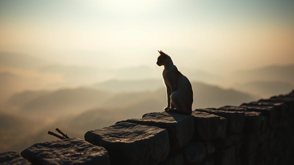A solitary slender Siamese cat silhouetted against a misty horizon, perched elegantly on a weathered stone wall, cinematic ultra-wide panoramic view, ethereal morning light casting long shadows, rolling hills fading into infinite layers of atmospheric perspective, golden hour photography, soft bokeh ...