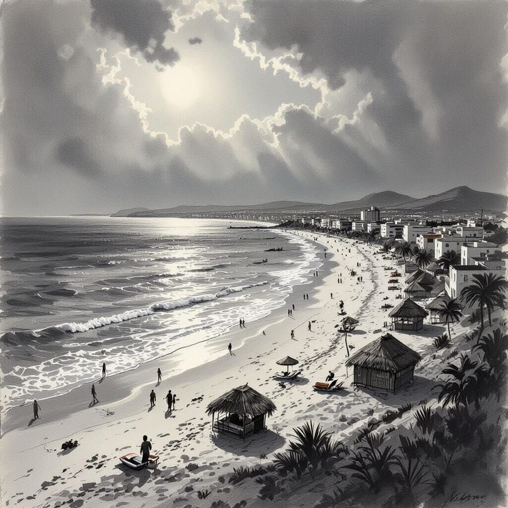 A hyperdetailed charcoal panorama of the Mussulo peninsula in Luanda, Angola. Features beaches, huts, and restaurants with dramatic lighting and deep shadows.
