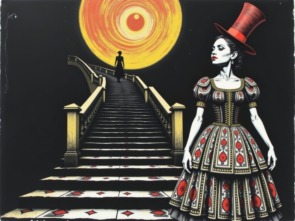 A surreal image of the Queen of Hearts, Mad Hatter, Alice and Neo on an Escher-like staircase. The scene features Klimt-inspired gold accents and aurora borealis patterns in a geometric pop art style.