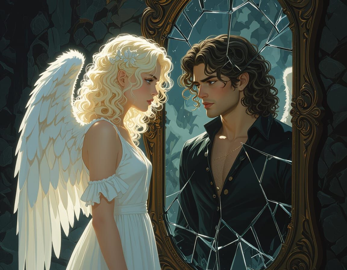 This image shows a sorrowful angel before a broken mirror. The reflection reveals a darker, male counterpart filled with longing. This fantasy concept art is rendered as a detailed matte painting with rich, complementary colors.