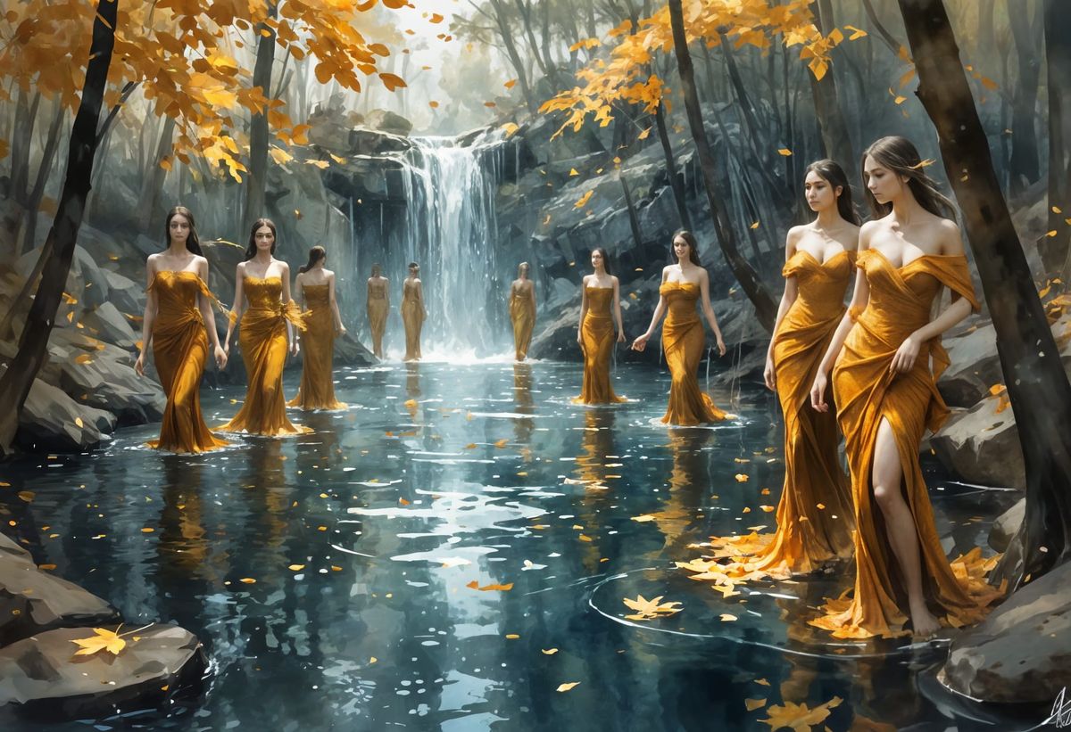 This image depicts majestic waters in an autumn forest setting. Female spirits, adorned in leaf loincloths, are surrounded by vibrant orange and yellow foliage in a detailed watercolor sketch style.