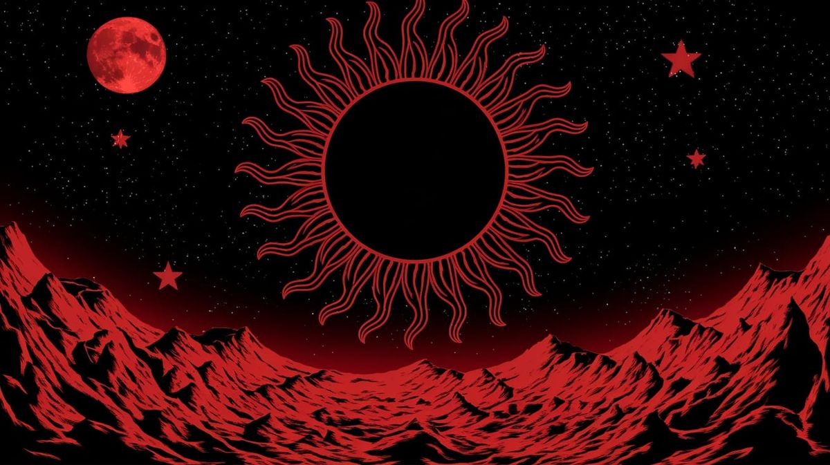 This image depicts a catastrophic scene with a black sun, a crimson red moon, and stars falling to earth amidst a torn landscape and earthquake destruction