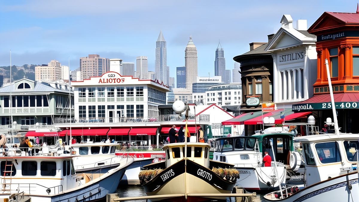 This image captures a scenic view of fishing boats at San Francisco's Wharf, with iconic restaurants and shops in the foreground, set against the backdrop of the city's majestic skyline.