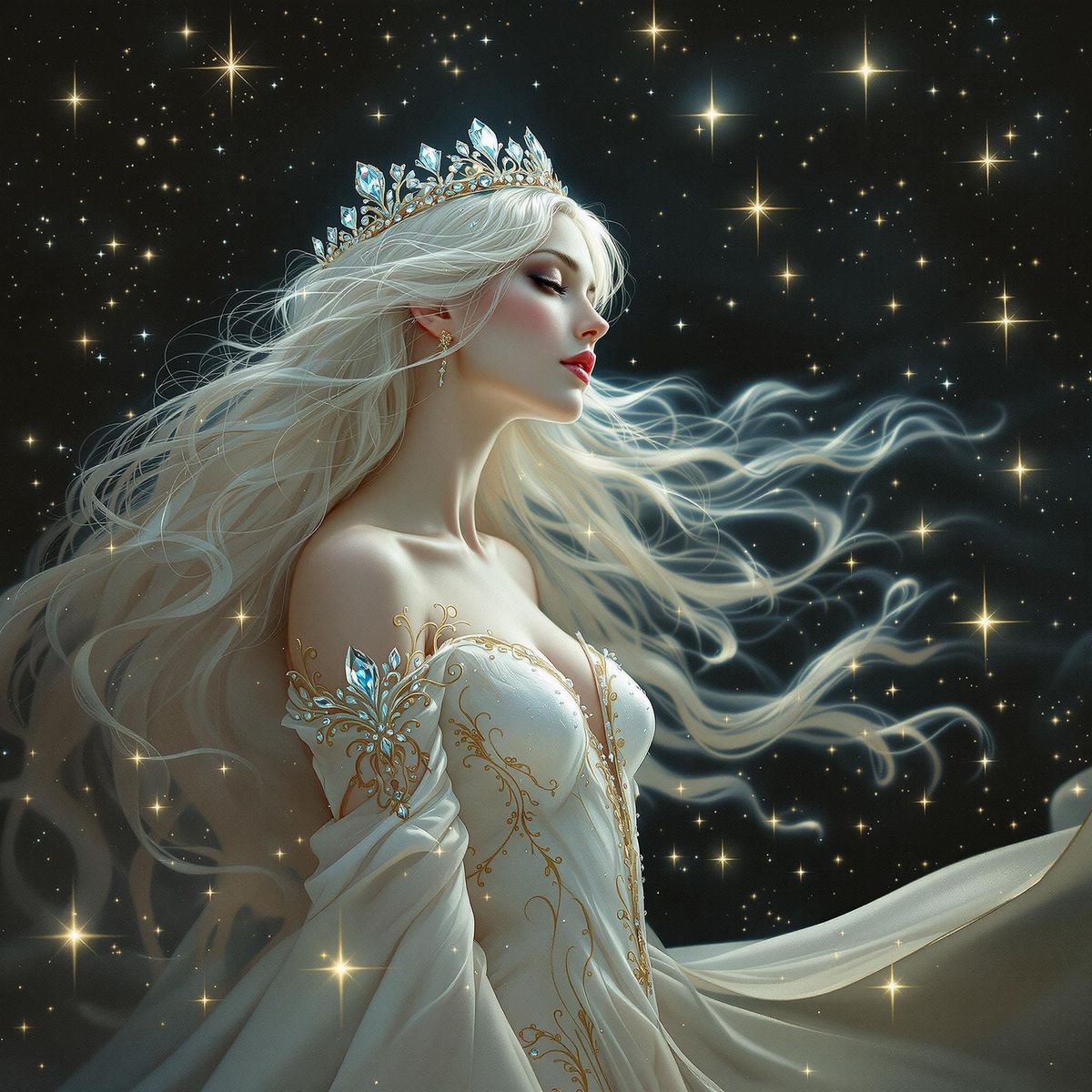 A beautiful princess woman shines in a starry night, wearing a diamond crown and flowing white gown with gold details, evoking the elegance of Art Nouveau and dreamy fantasy art