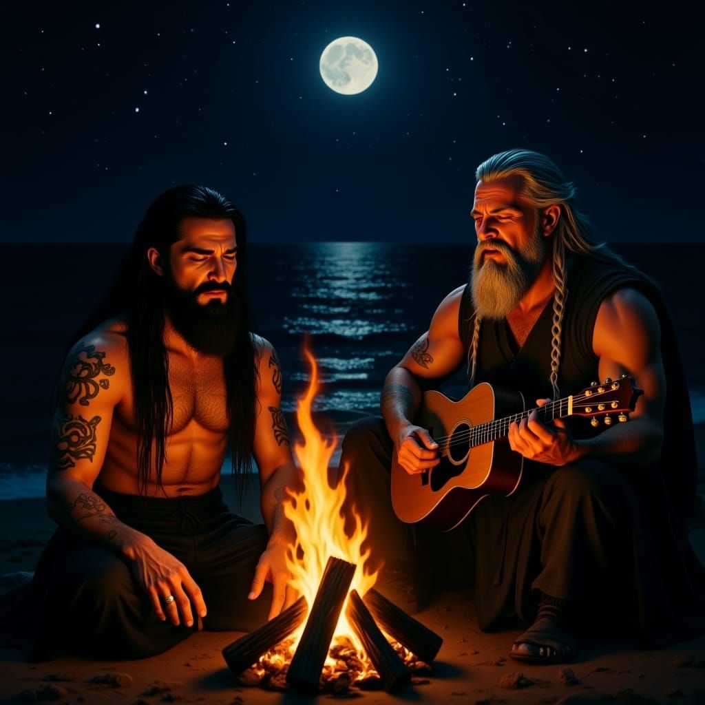 A dark fantasy scene depicts a tattooed wizard meditating by a fire on a moonlit coast. An epic, muscular Viking plays guitar beside him, with dramatic lighting and desaturated colors.