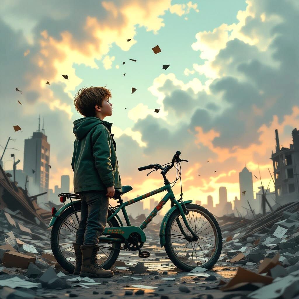 This image depicts a young boy in a dirty green jacket standing with his broken, muddy bike. The surroundings show ruined buildings, with wind blowing flying debris and paper under a powerful, beautiful sky.