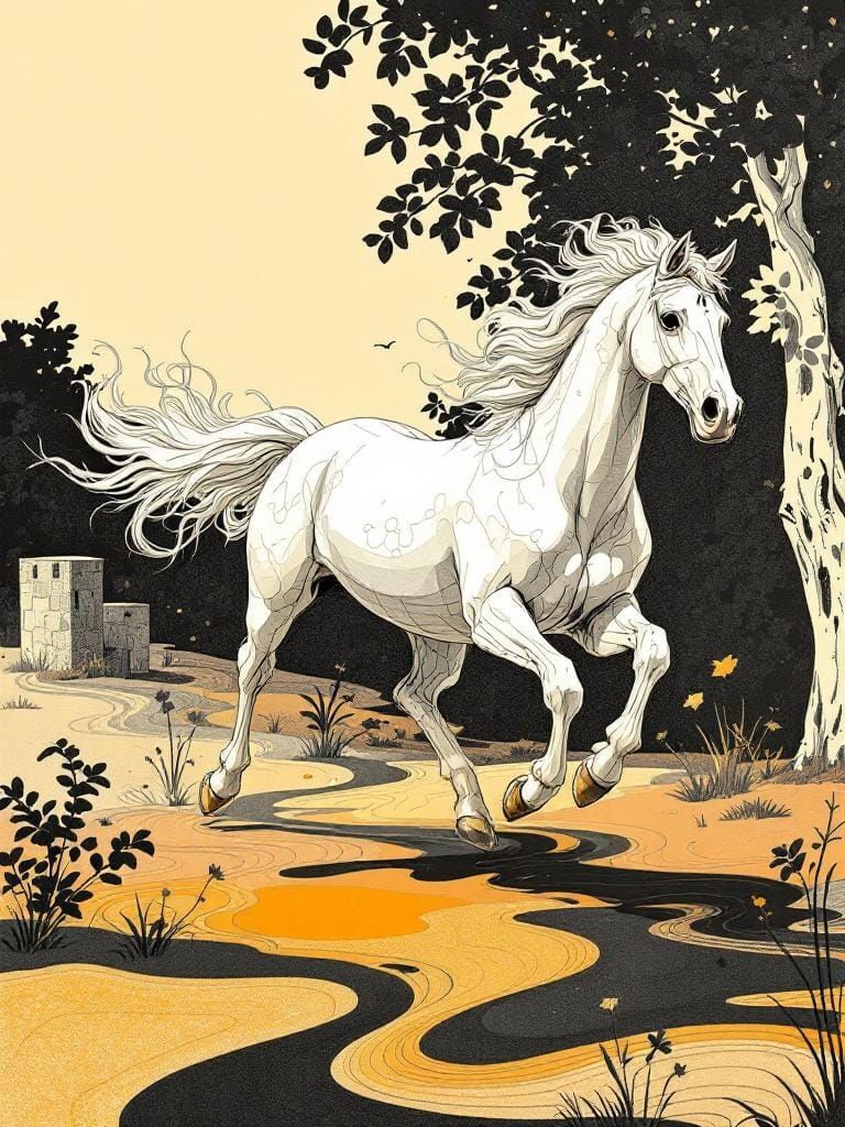 A striking picture of a horse running free. This artwork combines detailed linework and selective color accents to create an elegant and contemplative image, reminiscent of fine ink drawings.
