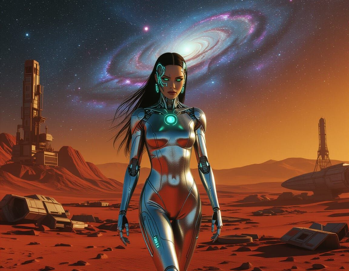 A striking image of a high-fashion woman with glowing skin and cybernetic implants on a desolate, rust-colored alien world. Features dramatic lighting and sharp details in a realistic fantasy style.