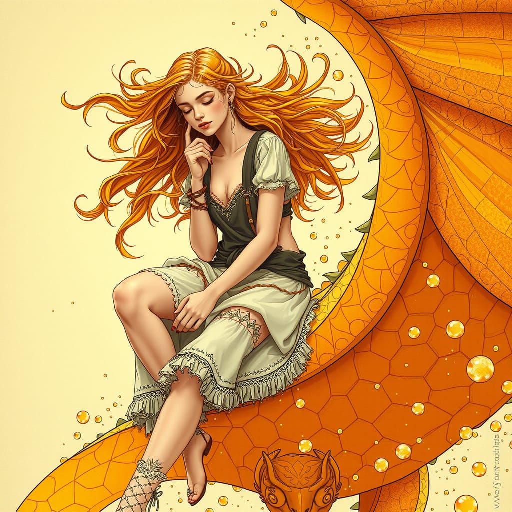 A striking picture of a woman with golden hair riding a giant gummy dragon. The image features vibrant colors and delicate linework with art nouveau and imaginative realism elements.