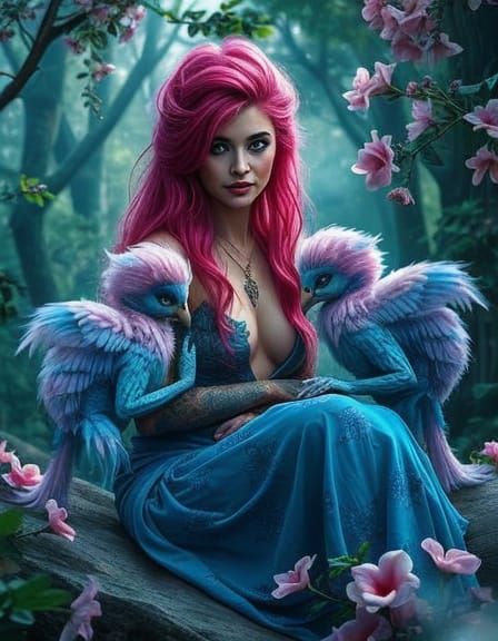 This image shows a woman with floral tattoos and fuchsia hair sitting in a forest. She is interacting with two colorful chimeras in a detailed, magical, hyperrealistic dreamscape, rendered with wispy textures.