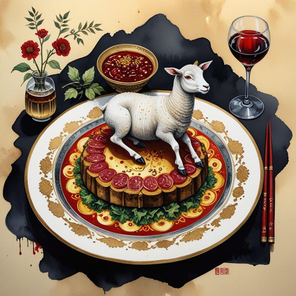 A sumptuous still life painting in the style of oriental folk art, featuring a lavish arrangement of food and dessert items in rich, vibrant colors with a hint of gothic mystery, reminiscent of antique watercolors.