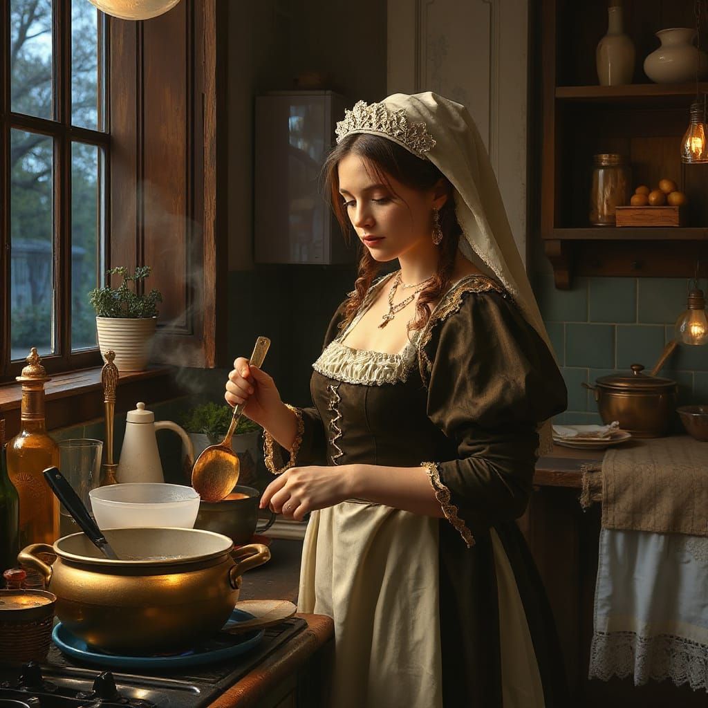 A digital painting of a medieval maid in an elegant kitchen, preparing food in the evening. The artwork evokes Pre-Raphaelite and Renaissance painting styles.