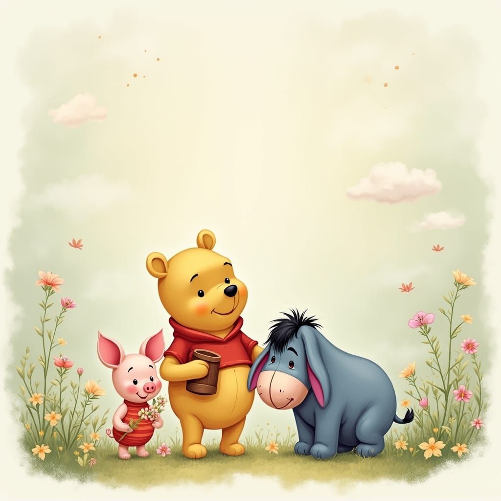This charming image features Winnie the Pooh, Piglet, and Eeyore standing together in a soft, whimsical forest, surrounded by fluffy clouds and delicate wildflowers, all rendered in a dreamy, classic children's book illustration style with a muted pastel color palette.