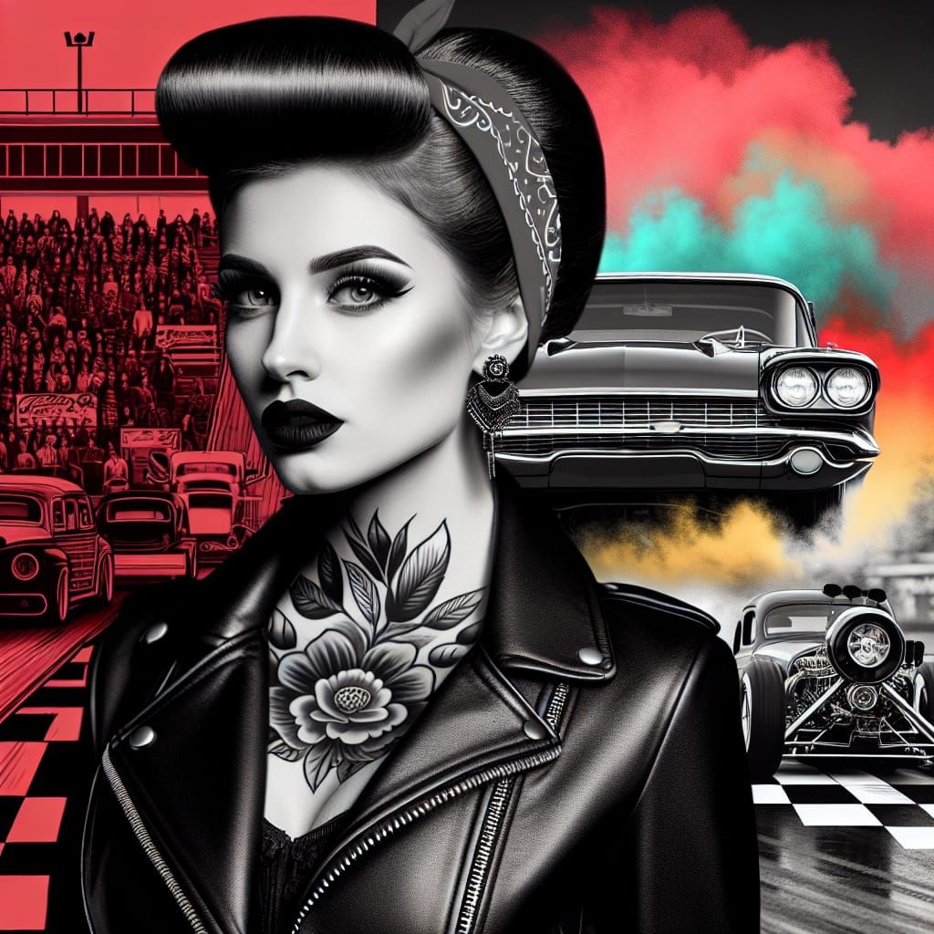 A striking image of a woman in a vintage pin-up hairstyle, standing in grayscale tones, amidst a vibrant drag racing scene with classic cars and smoke-filled atmosphere