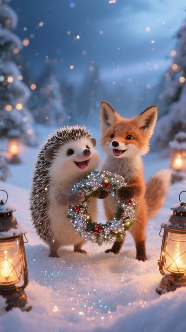 This photorealistic image captures a baby hedgehog and fox joyfully holding a glittering Christmas wreath. Warm lanterns illuminate the sparkling snowy landscape under a twilight sky, creating a magical holiday atmosphere.