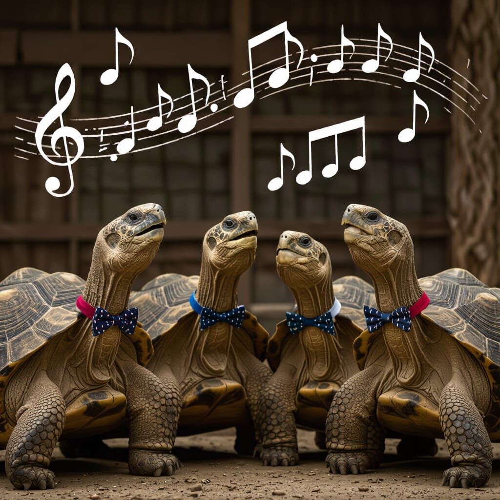 This image shows four Galapagos tortoises in a barbershop quartet, wearing bow ties and singing. Musical notes float in the air, capturing the harmony of their performance.