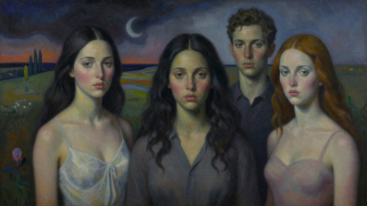This image depicts a surreal scene with four individuals, created with heavy oil paints and detailed gouache. It features dreamlike colors and dramatic lighting, inspired by surrealist masters.