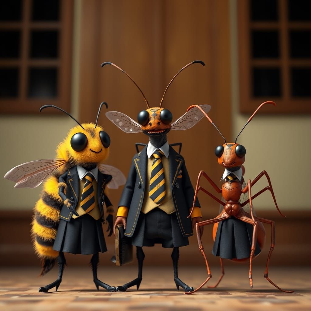 This image shows three insects dressed in school uniforms. A bee, dragonfly, and ant are depicted with pony tails in a photorealistic style, attending Insect High private school.