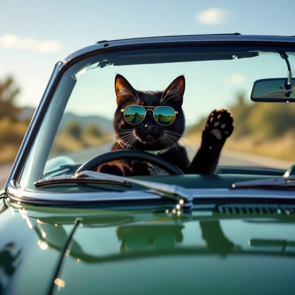 A black cat wearing sunglasses and a leather jacket drives a green Jaguar convertible, waving at the viewer. Features clean lines and neon accents in a futuristic style.