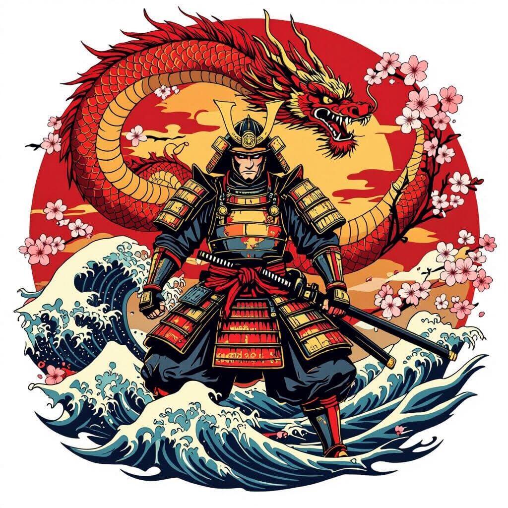 This image shows a full back tattoo design in a Japanese Yakuza style. A samurai warrior in armor stands with a dragon, cherry blossoms, and ocean waves in vibrant red and gold tones, as a symmetrical vector design.