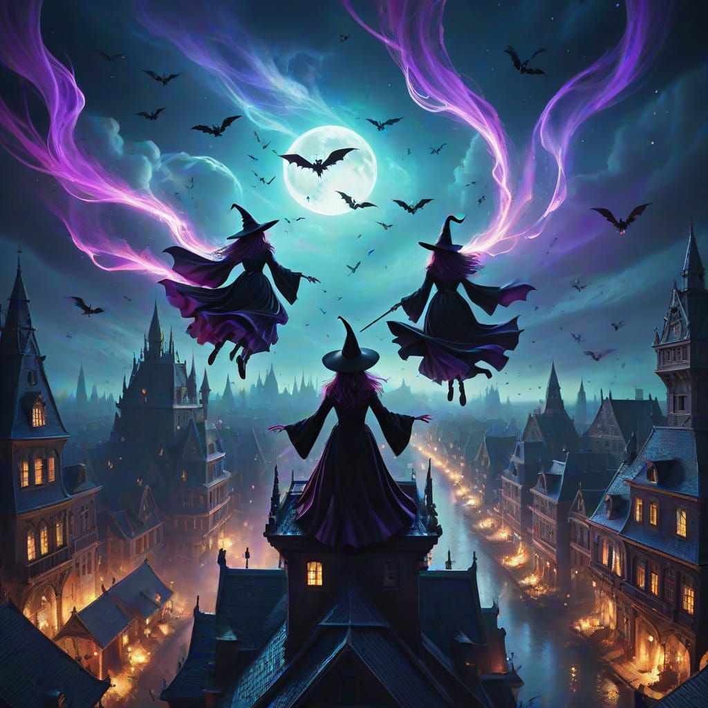 This digital artwork depicts a coven of witches soaring over a golden, fantastical city under a midnight sky. Cinematic lighting creates an ethereal glow, with streaks of luminescence adding to the magical atmosphere.