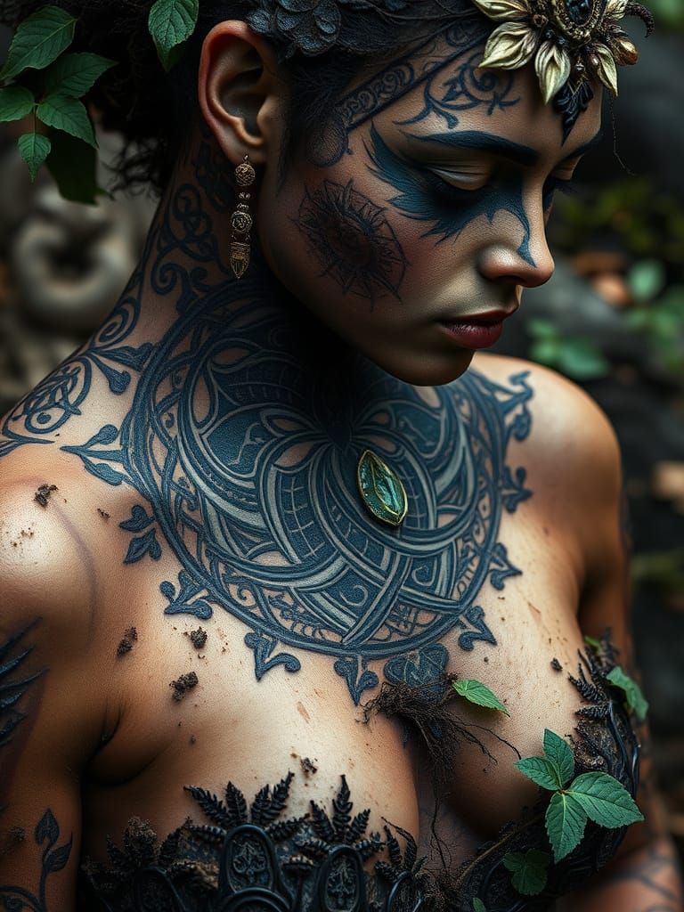 Photorealistic image of a dryad with a detailed mandala tattoo on her skin, featuring Celtic knots, forest elements, and colored stones, in a dark fantasy setting with cinematic effects.