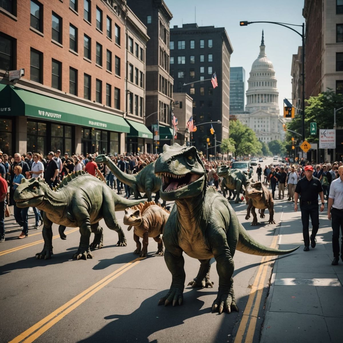 This image depicts dinosaurs carrying Donald Trump in a parade through a modern city street in Washington. The scene features numerous dinosaurs.