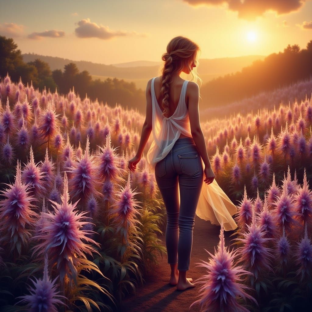 A serene and idyllic scene of a vintage cannabis farm in the Rheingau, with radiant purple plants and beautiful female farmers harvesting the crops in soft, ethereal light, reminiscent of surrealist landscapes and whimsical textures.
