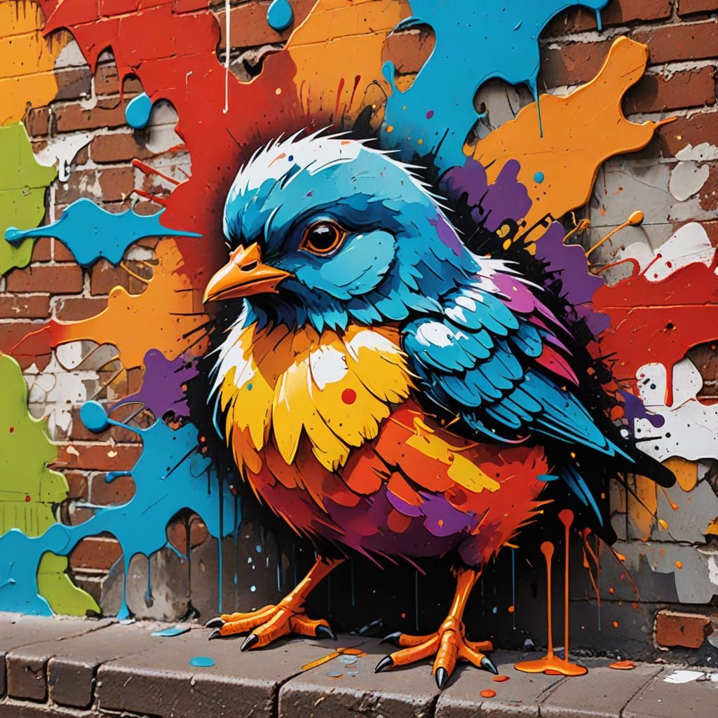 This image shows a close-up of a colorful street art chick on a brick wall in a bustling urban alleyway, featuring bold lines, vivid colors, and dynamic abstract patterns.