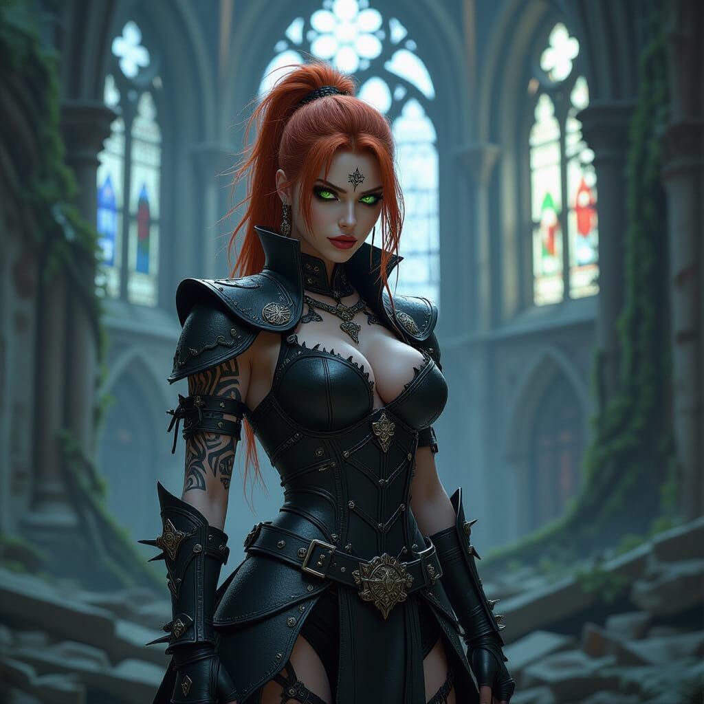 A striking picture of a powerful, ginger-haired demonic woman with tribal tattoos, standing in gothic ruins. The image is dark fantasy concept art with cinematic lighting and a gritty, heavy metal aesthetic.