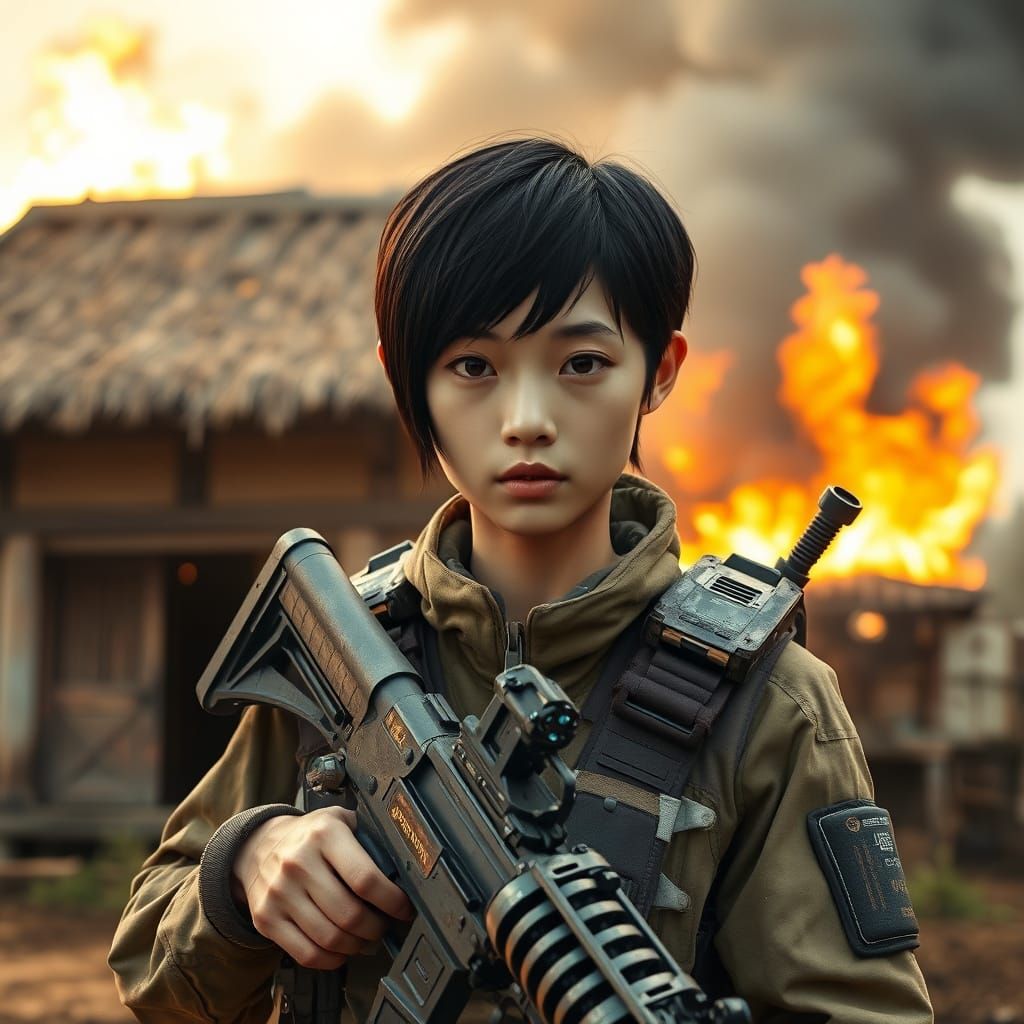 This image shows a young Japanese woman in a futuristic exoskeleton, holding a high-tech rifle, standing in front of a burning farmhouse, with a determined expression, captured in a warm, golden color grade, reminiscent of 35mm film stock