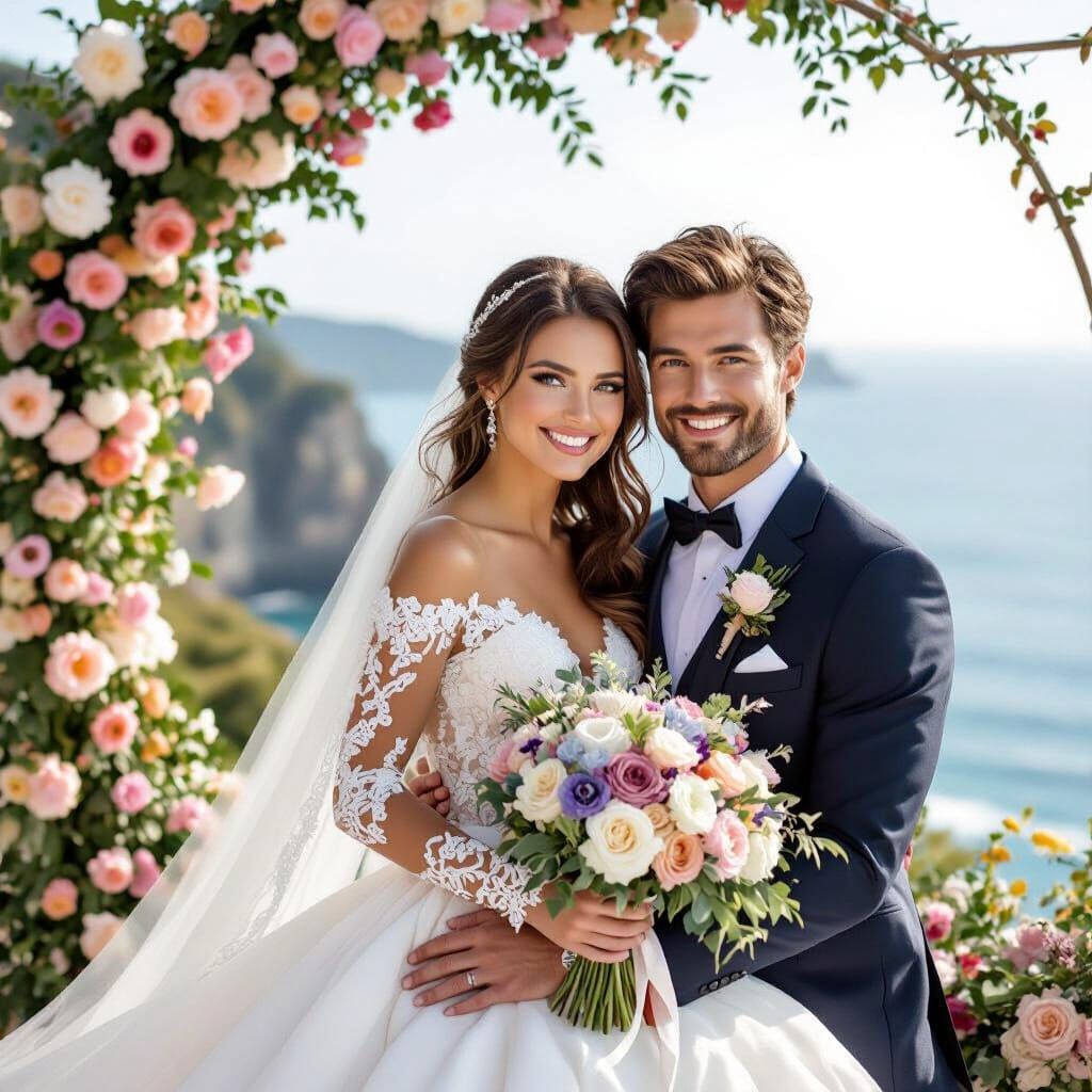 A striking picture of a young bride in a white lace dress, holding a flower bouquet by a floral canopy. The image evokes a whimsical, dreamy aesthetic with soft lighting and a gentle ocean breeze.