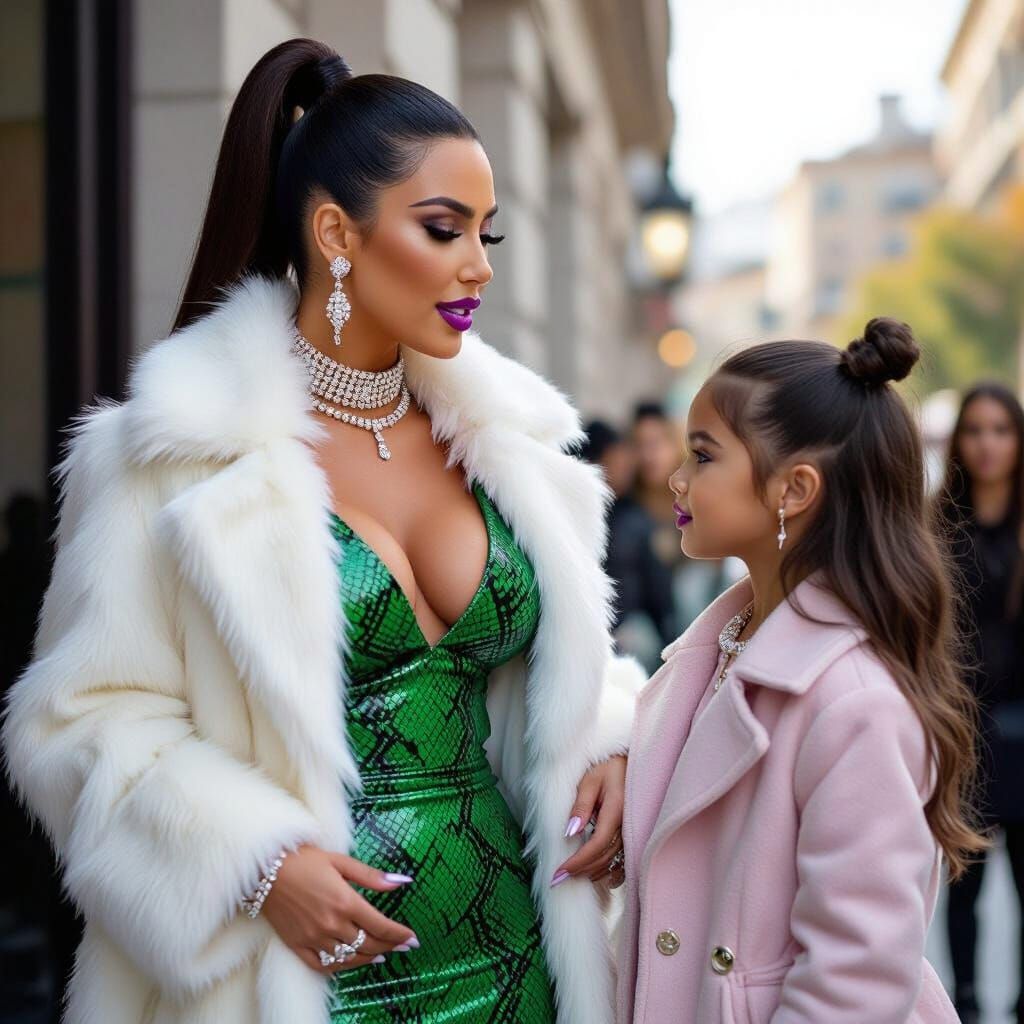 A vivid photograph of a woman in a snakeskin dress, fur coat, and jewelry talking to a younger lookalike. The image showcases glamour and vibrant colors.