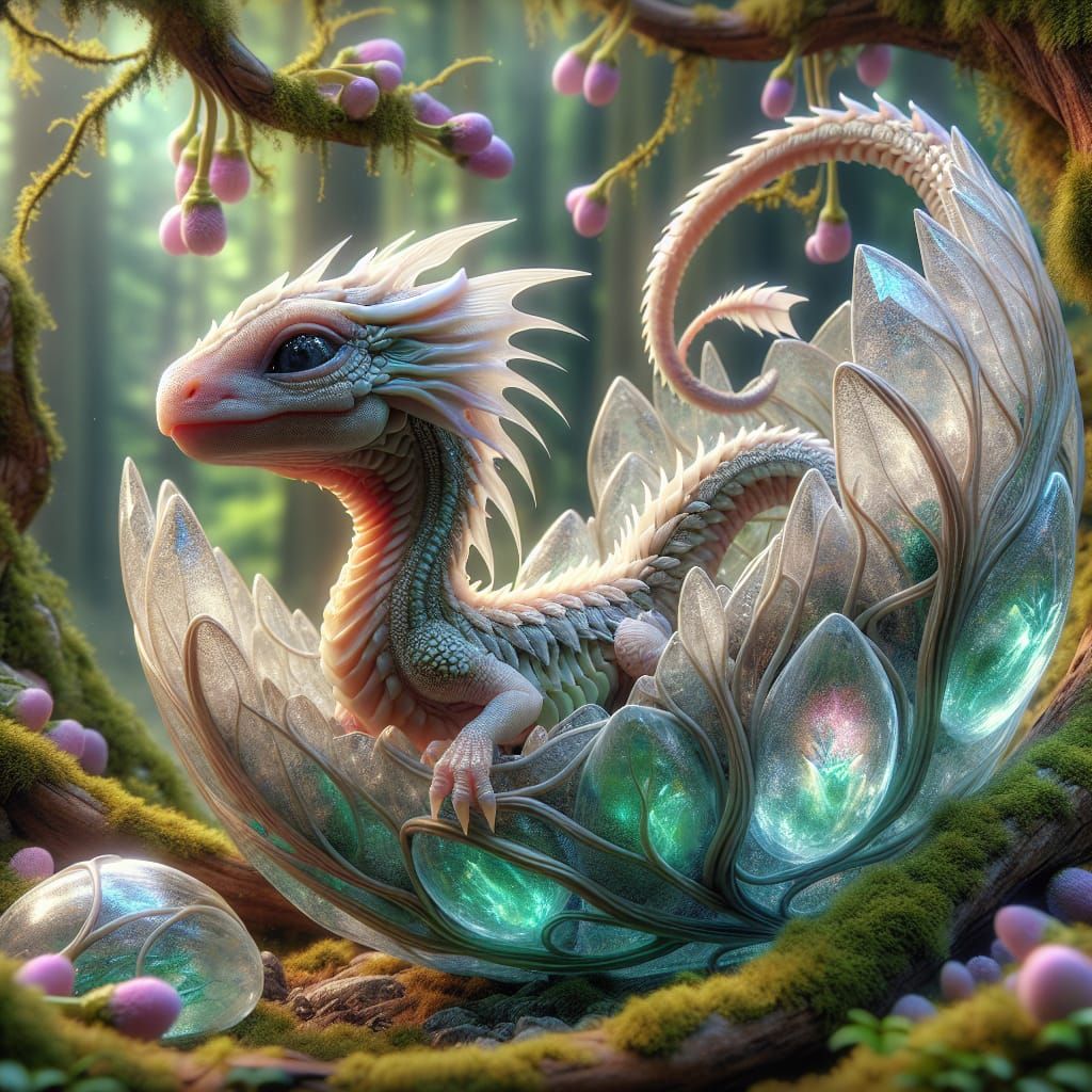 This image depicts a baby Moonvine dragonet emerging from a crystal seedpod egg in a breathtaking, fantasy setting. Delicate, petal-like scales adorn the creature, reminiscent of a forest serpent. The artwork showcases hyperrealistic, high-definition details, bringing the enchanted grove to life.